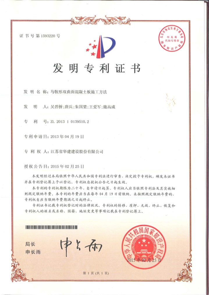 近日,从国家知识产权局传来喜讯,公司申请的一项发明专利《马鞍形双曲面混凝土板施工方法》获得发明专利授权(专利号:2013101395102,专利权人:吴碧桥 唐兵 朱国梁 王爱军 施高成)。