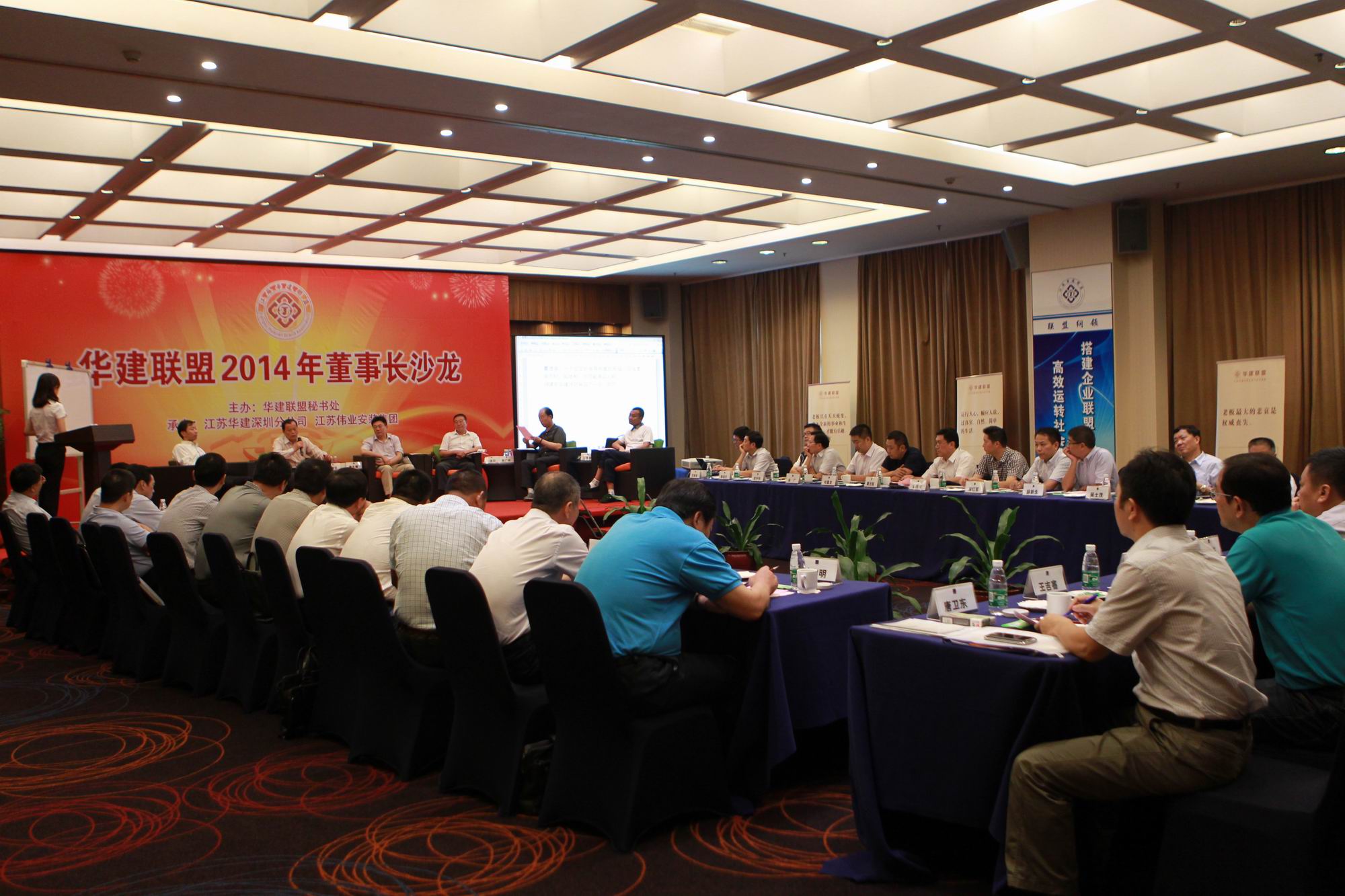 9月20-22日,华建联盟2014年董事长沙龙在深圳举行,各联盟成员单位、观察员单位董事长和江苏华建各区域公司总经理共38人参加。整个沙龙活动从参观特色项目玛丝菲尔和反映特区巨变的深圳改革开放展览馆开始,背景、KT展板、X展架、投影仪、白板、音乐视频和沙龙沙发、敞开U型会议桌组成的会场打造了全新的、开放的沙龙氛围。