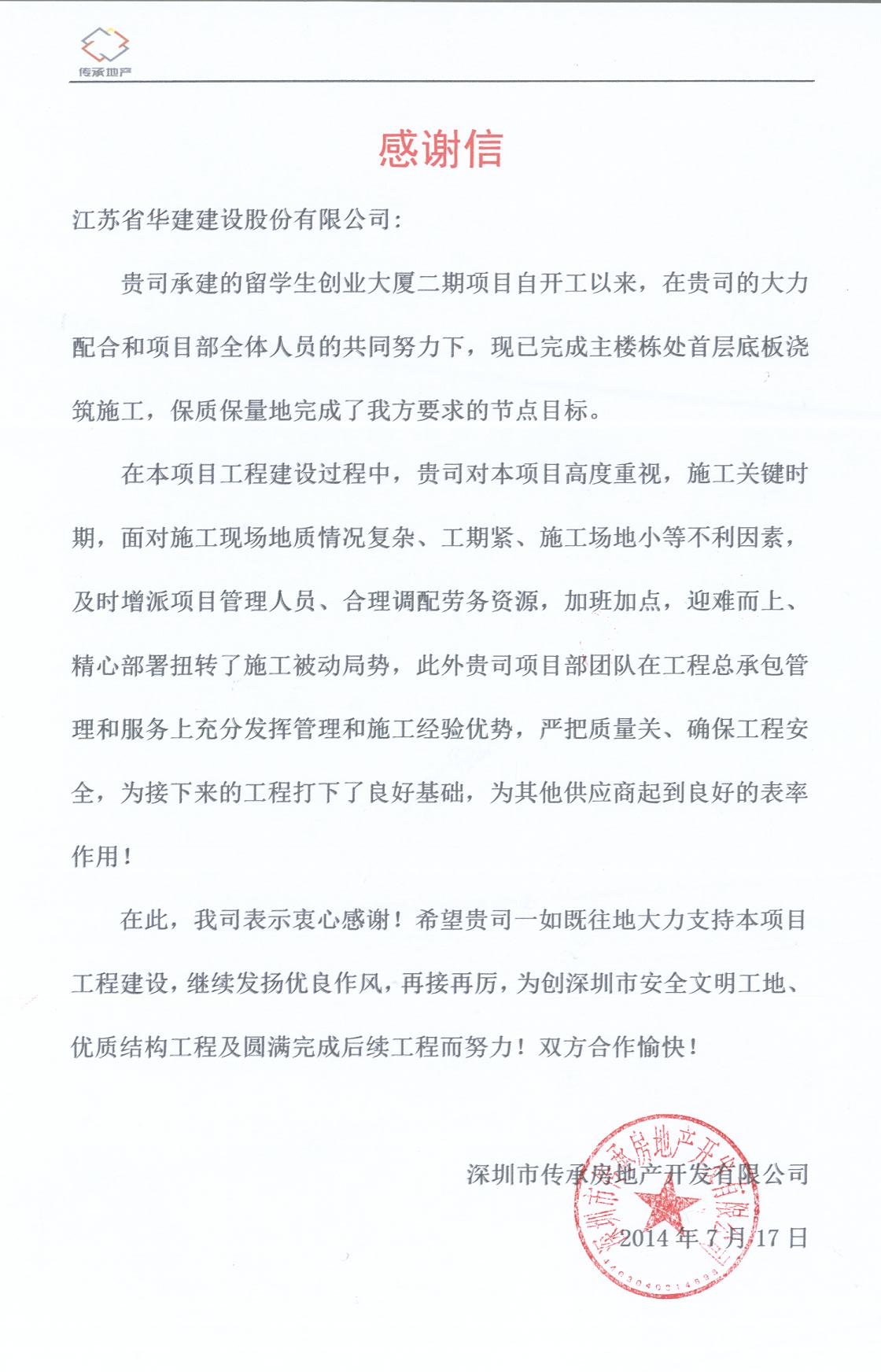 留学生创业大厦(二期)工程,为深圳市科创委建设的重点工程,建筑面积近4万平方米,地下室二层、地上25层。我司从6月1日起进场正式施工,克服了深基坑施工困难、地质条件复杂、场地狭小等不利因素,用46天时间就实现了主楼部位二层地下室封顶,帮助业主抢回前期被延误的工期,受到业主及股东的高度赞扬,并向我司送来了感谢信。 (第一工程处)