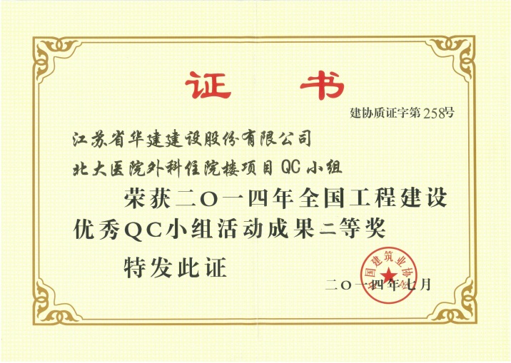 近日,在中国建筑业协会组织的2014年度全国工程建设优秀QC小组活动交流会上,公司北大医院外科住院楼项目QC小组携成果“提高外墙砂胶仿瓷砖涂料施工质量合格率”参与了发布交流,并荣获优秀QC成果二等奖。(技术质量处)