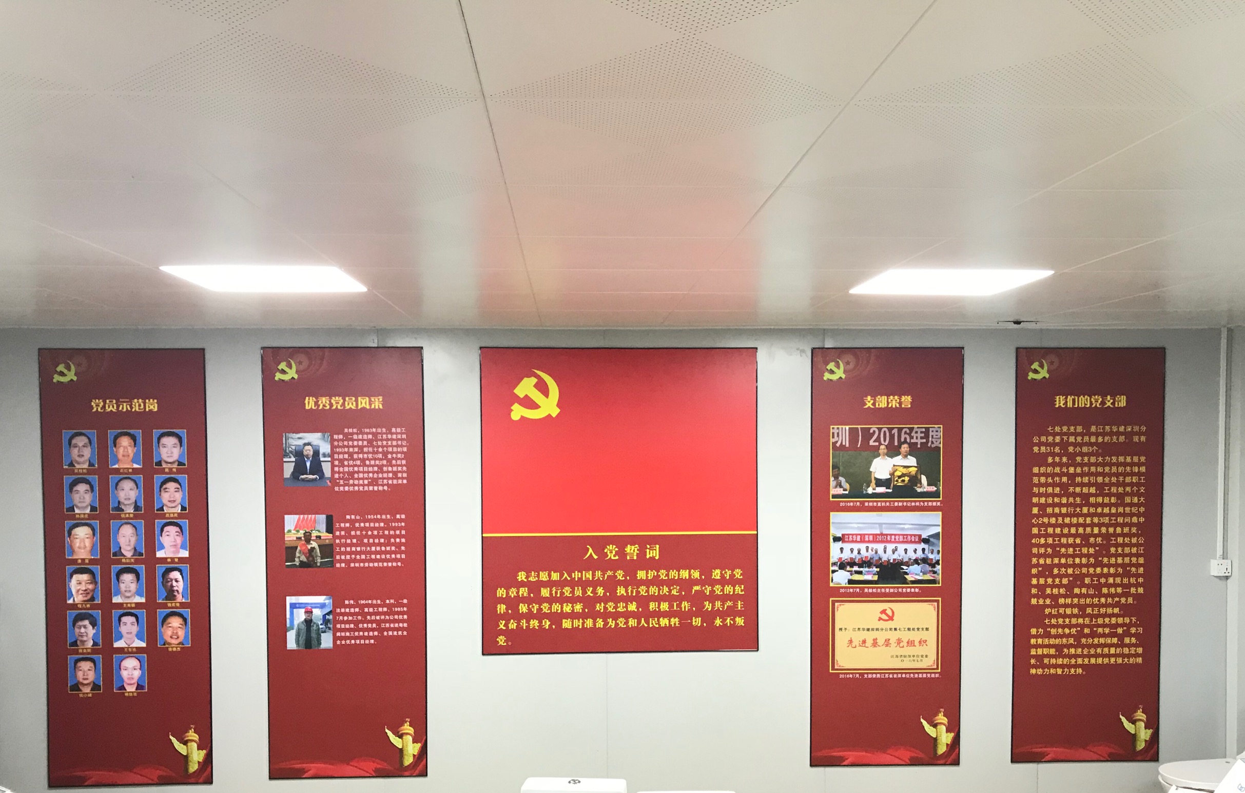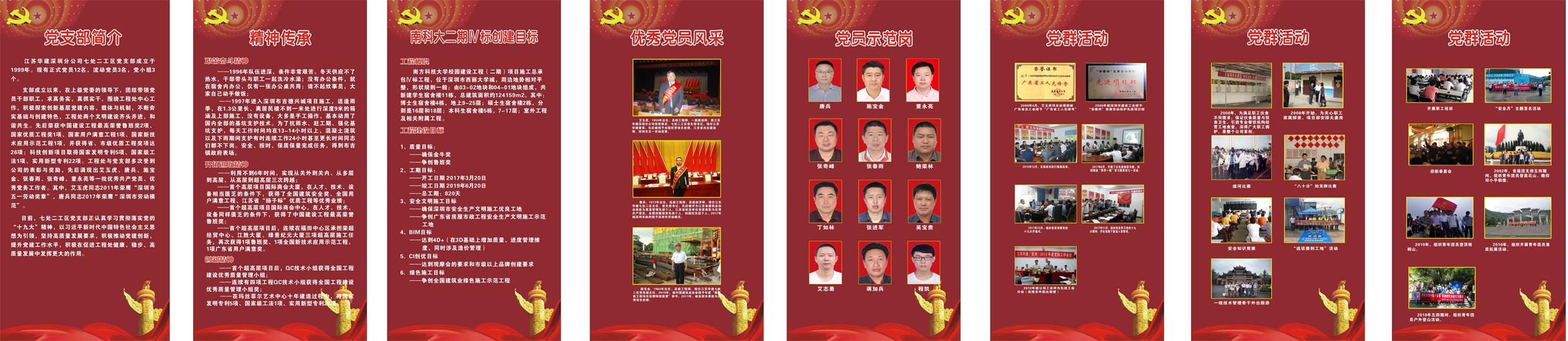 南科大二期Ⅳ标段党建园地由“党支部简介”“精神传承”“创建目标”等15个板块组成;坝光人才公寓项目由“我们的党支部”“支部荣誉”“深入学习贯彻党的十九大精神”等10个板块组成。