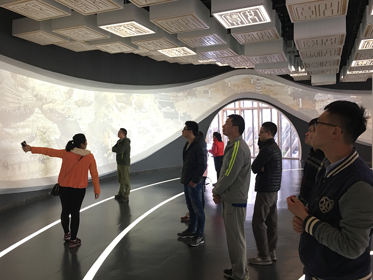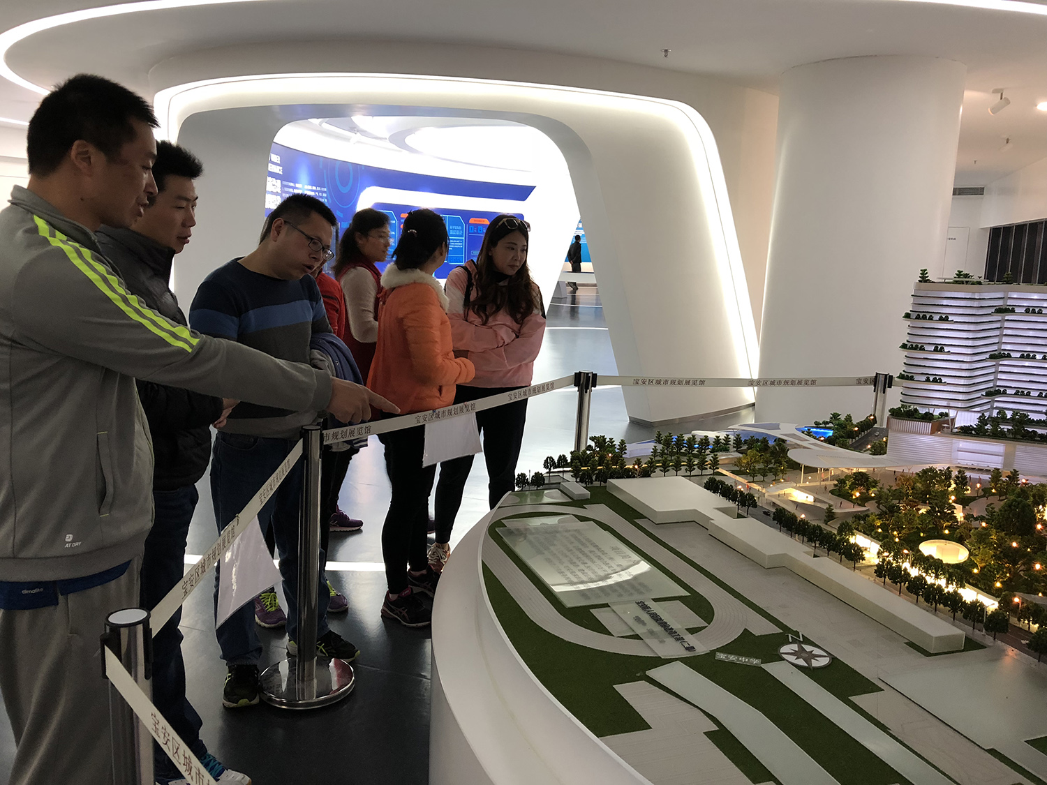 登山结束后,大家一起来到宝安区城市规划展览馆。该馆于2016年11月正式开馆,以“滨海宝安、产业名城、活力之区”为设计主题,以滨海特色为设计元素,分为“岭南古邑”、“春天传奇、”“山川积秀”、“名城华章”、“滨海筑梦”五个区域。此外,馆内设置的声光电数字沙盘、AR增强现实、VR虚拟漫游、裸眼3D碗幕影院、宣传影片等现代高科技手段引得大家纷纷驻足观看。通过参观,大家对宝安区的历史、人文、建设成就以及未来规划蓝图有了更加深入的了解,宝安滨海文化公园、空港新城等一系列城市规划前景令人心潮澎湃、倍感振奋,进一步点燃了大家在新时代投身企业发展、建设美丽深圳的豪情与决心。