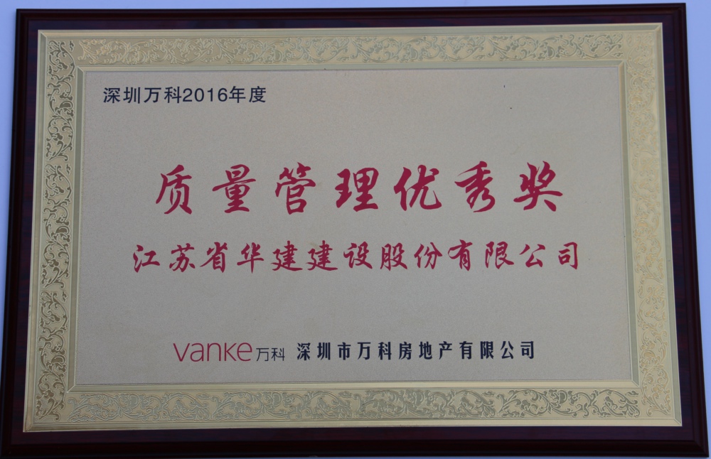 元月5日,深圳万科工程系统2016年年终盛典隆重举行,江苏省华建建设股份有限公司凭借出色的工程质量管理,被深圳市万科房地产有限公司授予2016年度“质量管理优秀奖”,并获得奖励。